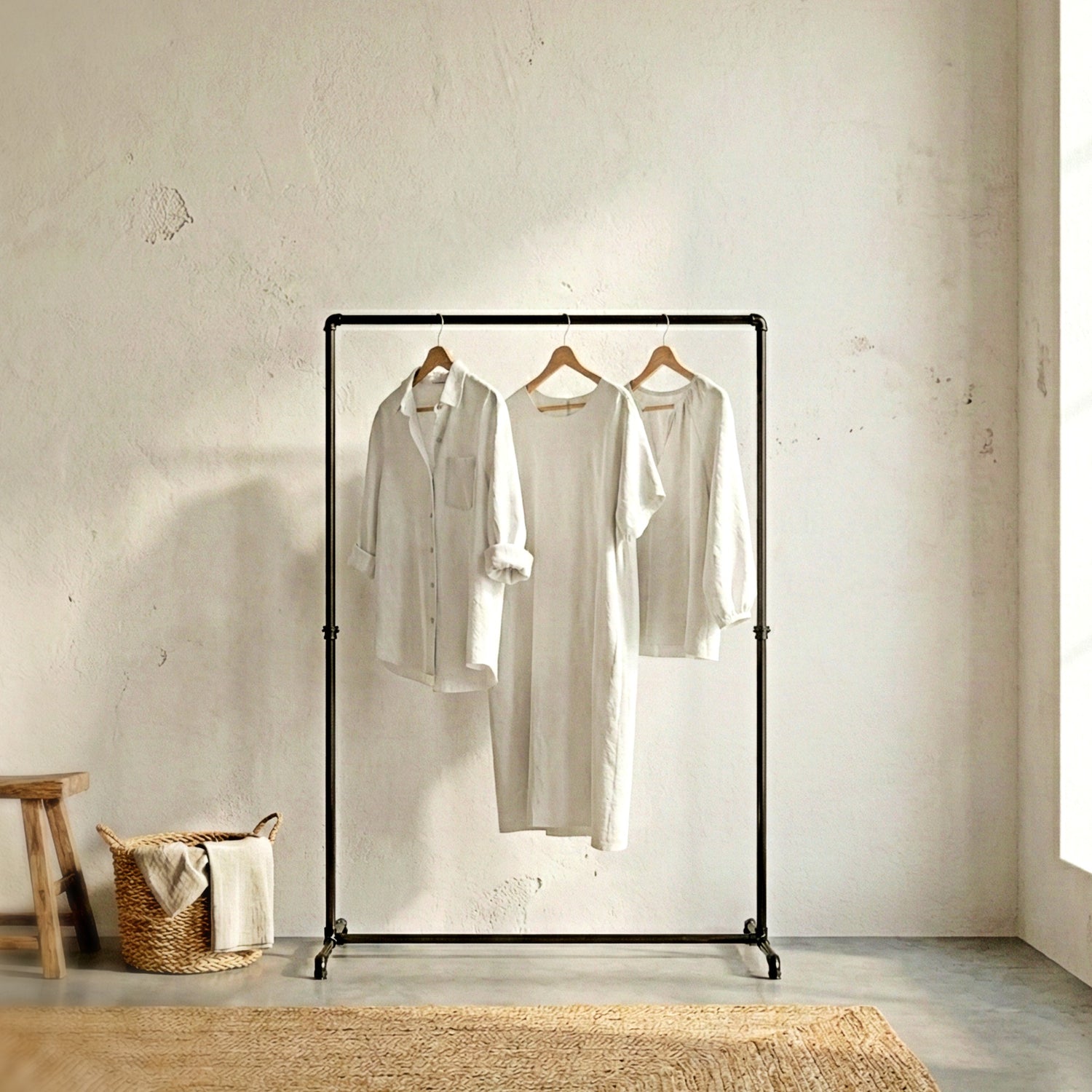 Let op: Dit model is afkomstig uit onze "Déco"-lijn. Het is ideaal voor lichte kleding of als extra kapstok. Voor zeer zware belasting (leren jassen, intensieve opslag) adviseren wij onze rekken van echte loodgietersbuizen.