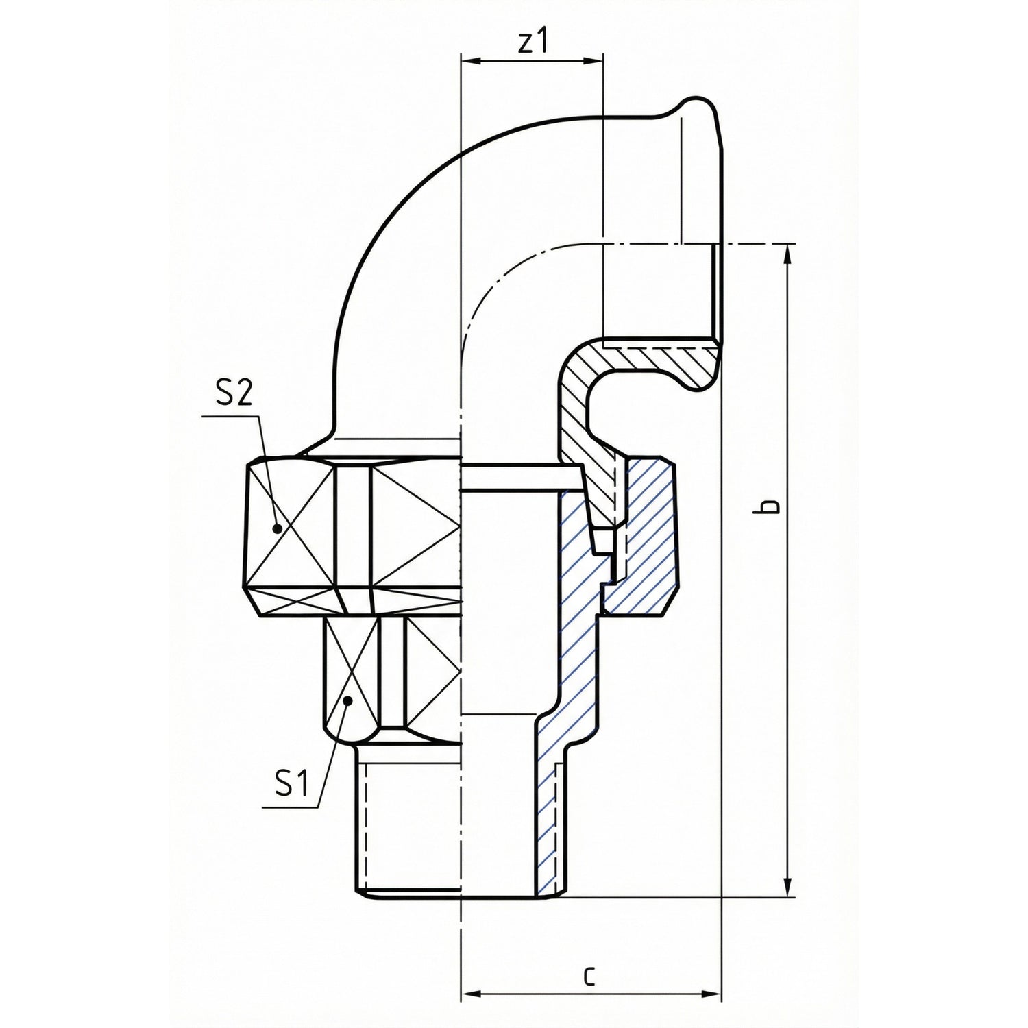 | Maat | DN | Ø Fitting | b (mm) | c (mm) | z1 (mm) | s1 / s2 (Sleutels mm) | L geschat (Tot. br.) | H geschat (Tot. h.) |